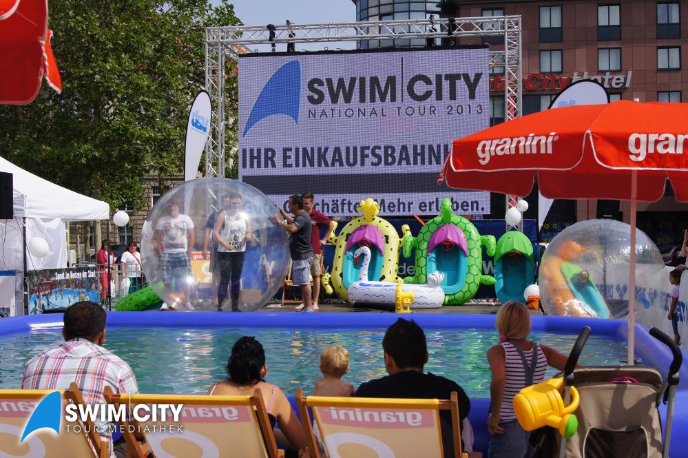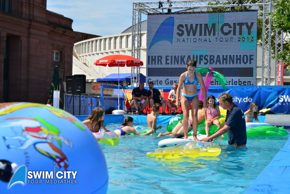 Die Premiere der SWIMCITY fand 2012 im Zeitraum der Olympischen Spiele in London statt. Unter der Schirmherrschaft vom deutschen Rekordmeister Thomas Rupprath gastierte die mobile Schwimmstadt vor den Hauptbahnhöfen in Hannover und Berlin.